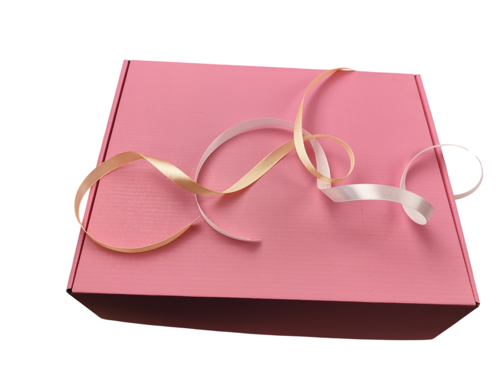 Pudełko prezentowe z okienkiem, o wymiarach: 36x30x8cm, wypełnione wełną drzewną i przyozdobione wstążką.