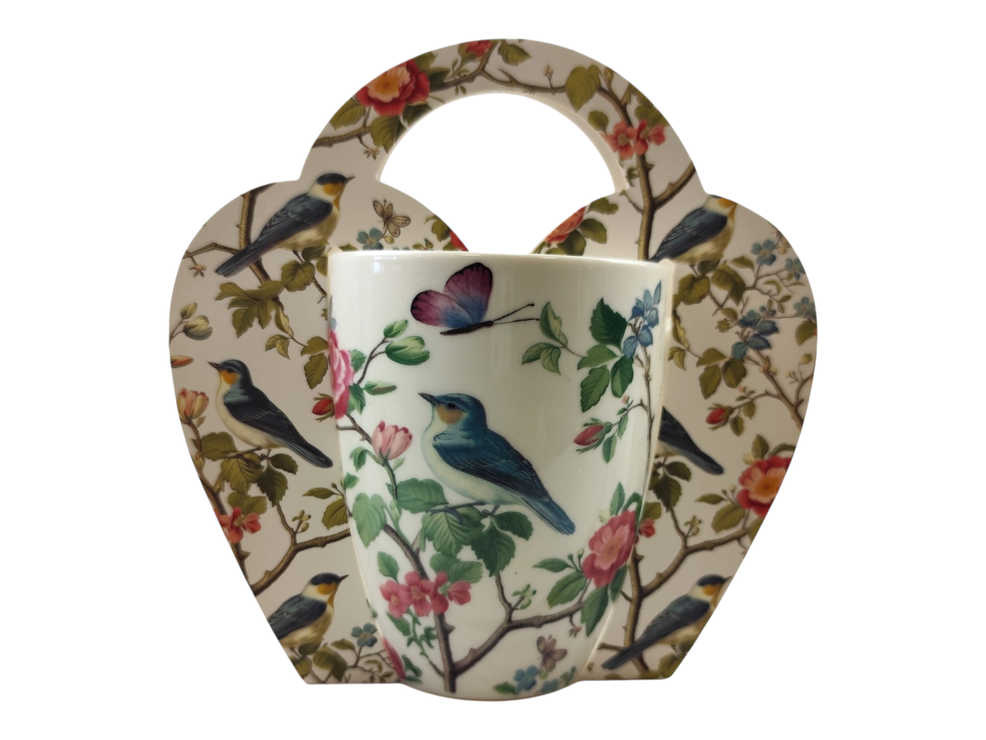 Kubek w koszyczku PTAKI NA GAŁĘZI wchodzący w skład serii CROCUS, wykonany z porcelany New Bone China, która charakteryzuje się naturalnym kremowo-białym kolorem z delikatnym połyskiem oraz wyjątkową wytrzymałością i trwałością, zachowując lekkość i finezję.
