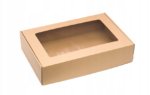 Pudełko prezentowe z okienkiem wielkie, o wymiarach: 45x30x10 cm, wypełnione wełną drzewną i przyozdobione wstążką, na naprawdę duży prezent.