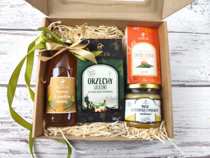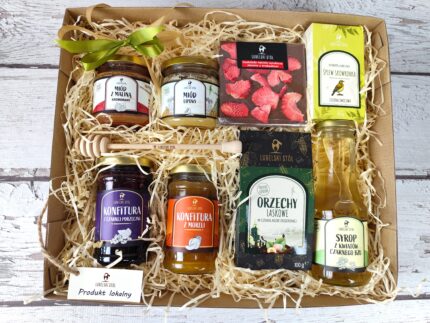 Zestaw prezentowy zawiera wysokiej jakości lokalne produkty: